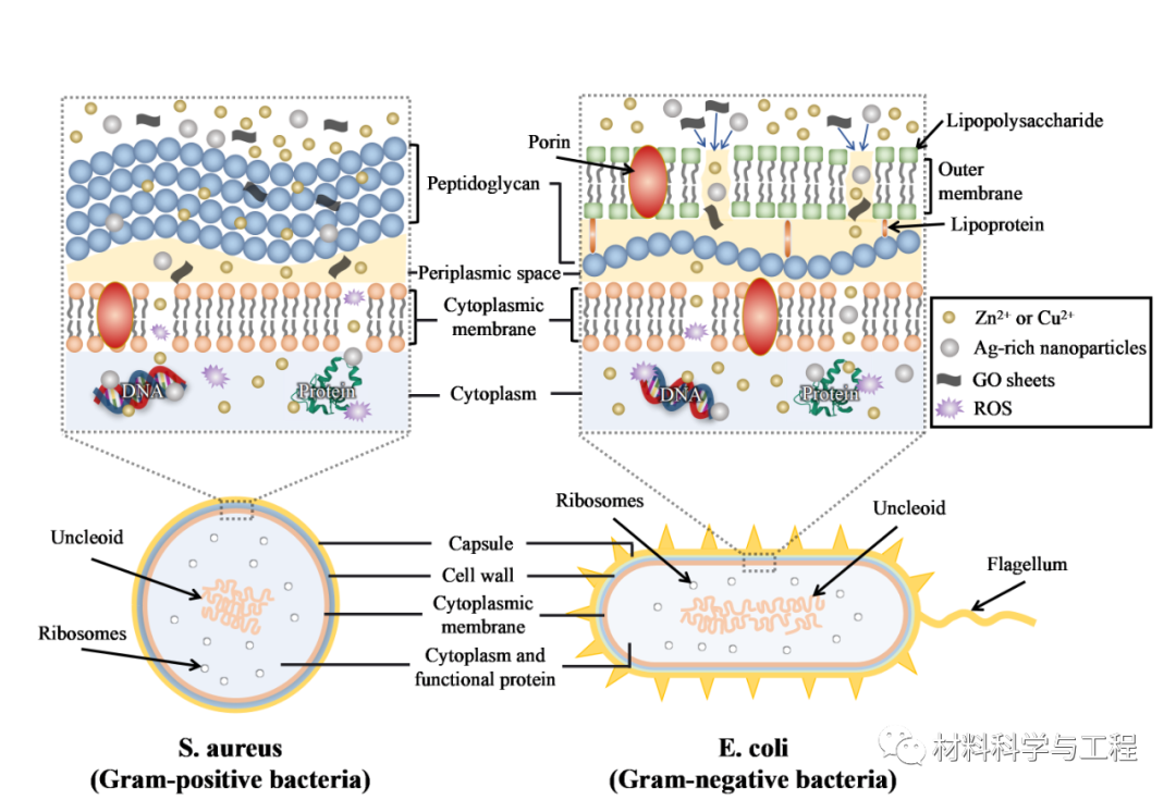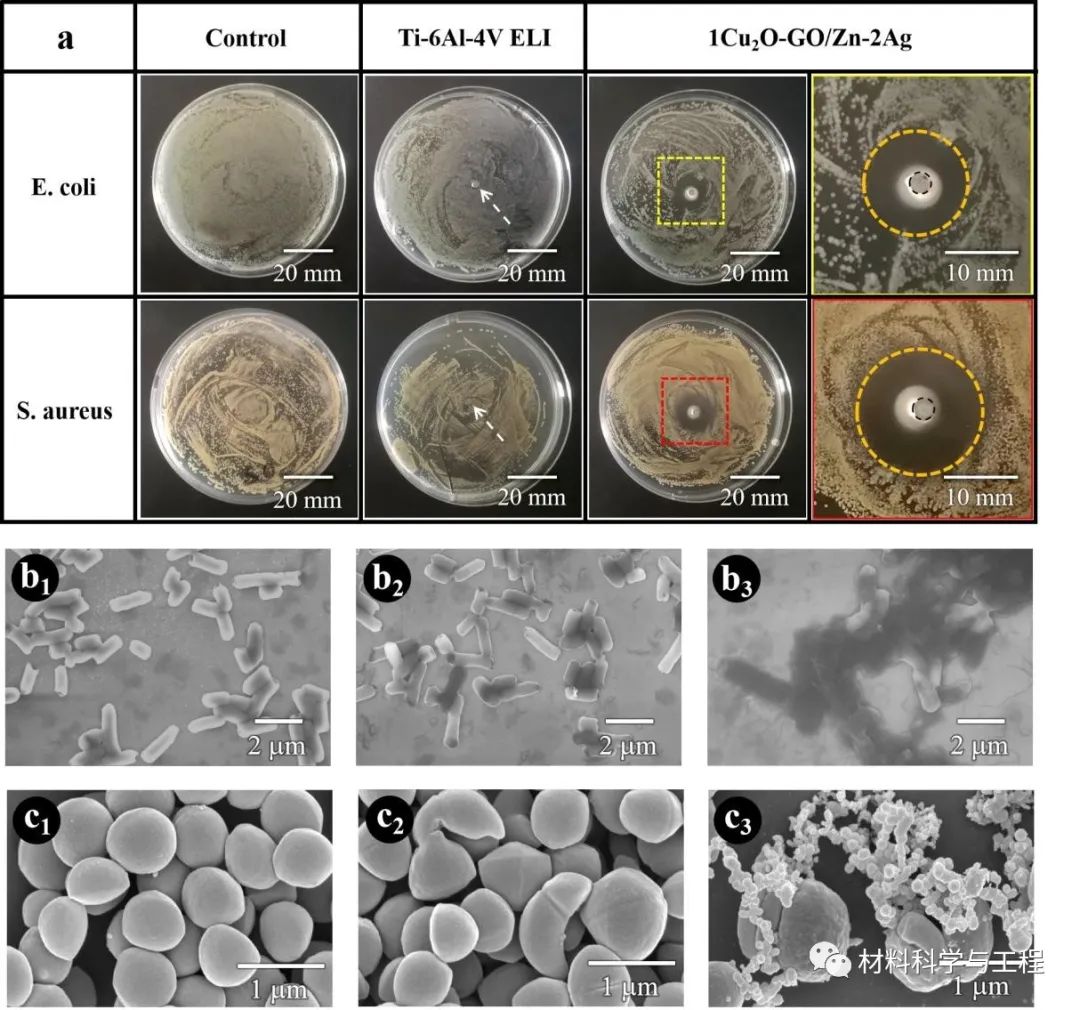 结果表明,烧结后1Cu2O-GO/Zn-2Ag复合材料中的Zn基体与GO增强体之间原位生成了ZnO中间相,这种ZnO中间相与GO以化学键形式链接,并与Zn基体产生了紧密的界面结构。因此,通过ZnO中间相,增强体与基体的界面结合能力得到了有效改善。EBSD分析表明,1Cu2O-GO/Zn-2Ag复合材料展现出亚微米级的晶粒尺寸,平均晶粒尺寸为360 nm。良好的界面性能、细化的晶粒尺寸与铜元素的原位合金化使1Cu2O-GO/Zn-2Ag复合材料展现出优异的力学性能,极限拉伸强度达到344.0 MPa,屈服强度达到314.0 MPa,断裂伸长率达到15.5%,满足骨替代材料临床应用的力学性能要求。在另一方面,1Cu2O-GO/Zn-2Ag复合材料可以在腐蚀降解过程中释出富银纳米颗粒、锌离子、铜离子与氧化石墨烯,从而形成协同抗菌作用,对大肠杆菌与金黄色葡萄球菌均产生了明显的抗菌效果。