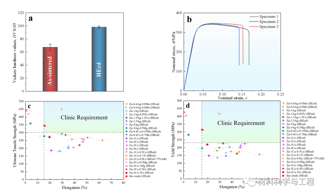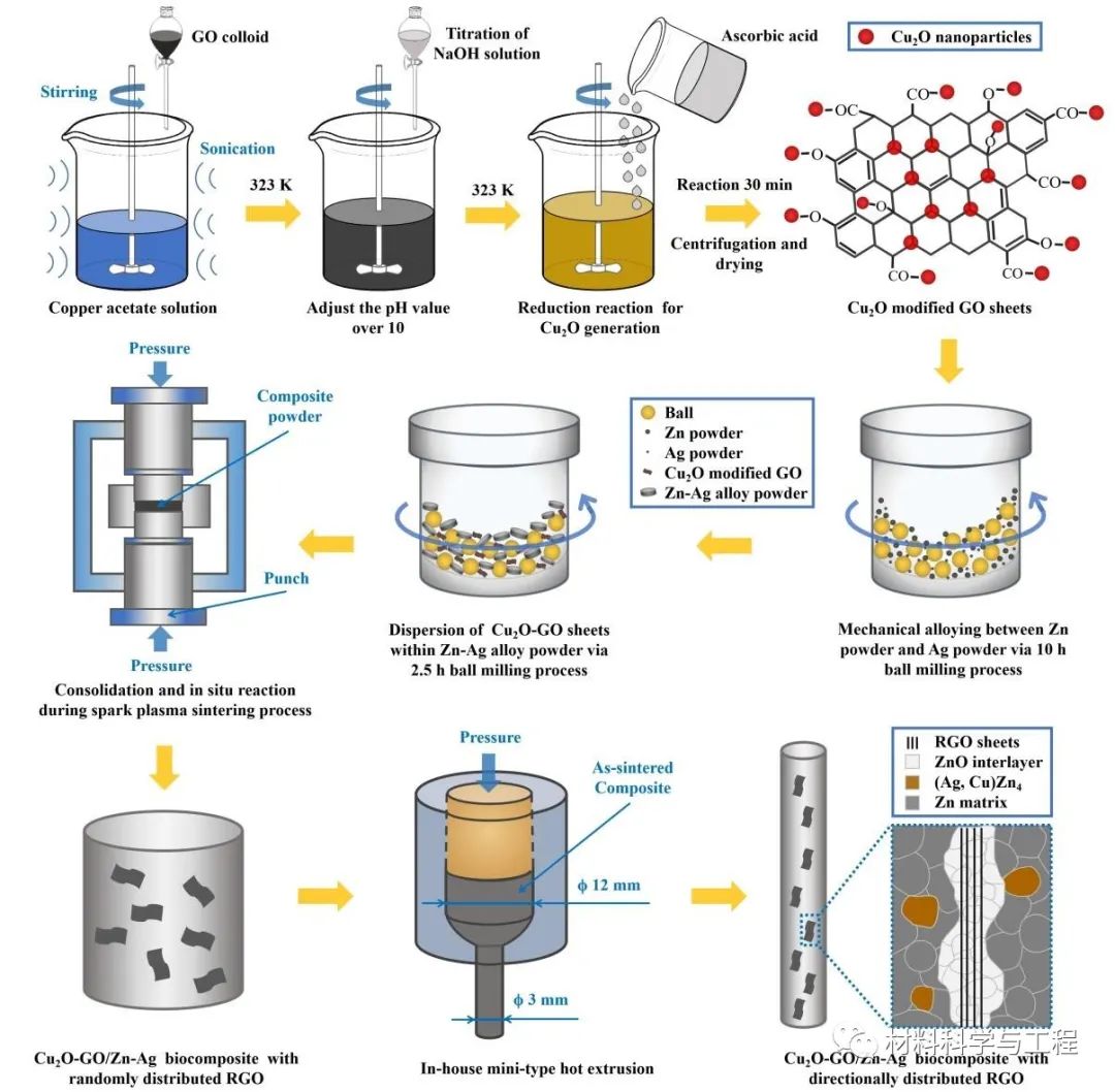 综上所述,本文中提出的氧化亚铜改性石墨烯诱导原位界面润湿策略不仅适用于锌银合金系统,还适用于各种以锌为主元的锌合金系统或以锌为合金元素的其他合金系统中。该方法在改善锌基体与增强体之间界面性能的同时,还能获得亚微米级的晶粒细化效果,从而大幅度提高锌基复合材料的力学性能。因此,今后利用该方法研究开发生物可降解锌合金基复合材料具备良好的前景与科学价值。
