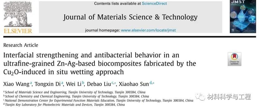 针对此问题,天津理工大学刘德宝教授课题组开发出了一种氧化亚铜诱导原位润湿策略,在锌银合金基体与增强体之间引入一种原位生成的氧化锌中间层,从而增强锌银合金基体与增强体之间的界面结合性能、改善复合材料的力学性能。与此同时,单质铜与氧化锌作为原位反应产物与合金元素银可以形成协同抗菌作用,从而赋予复合材料以优异的抗菌特性,获得兼具高强度与抗菌特性的生物可降解锌银基复合材料。相关文章以“Interfacial strengthening and antibacterial behavior in an ultrafine-grained Zn-Ag-based biocomposites fabricated by the Cu2O-induced in situ wetting approach”为标题发表在Journal of Materials Science & Technology。本文的第一作者为硕士研究生王潇,孙小淏讲师与刘德宝教授为共同通讯作者。