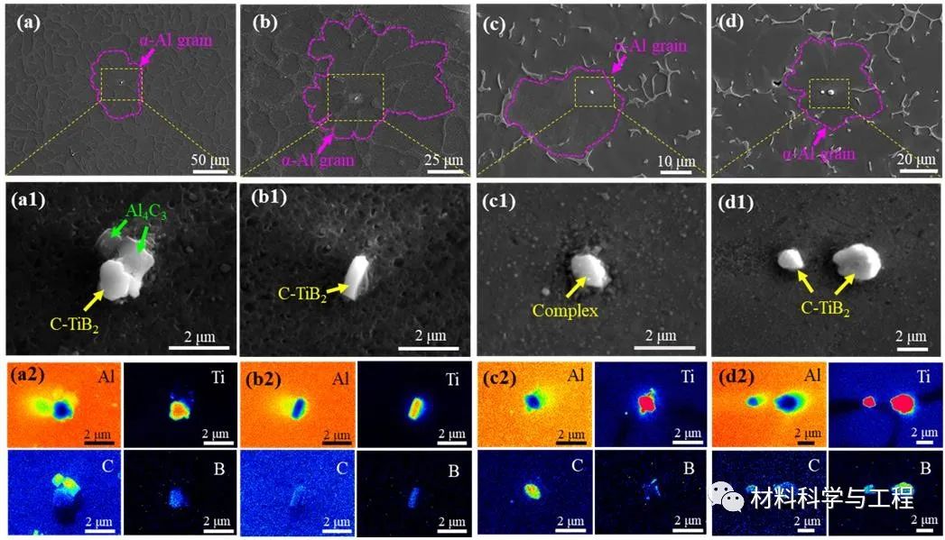 图4 TCB复合体在Al熔体中的演变。在Al熔体中,TCB复合体中的B-TiC演变成Al4C3,释放Ti,提高C-TiB2的数密度;C-TiB2为α-Al提供有效形核衬底,B-TiC演变过程中释放的Ti辅助细化α-Al。