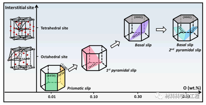图7. 不同氧浓度的α-钛的间隙位点和滑移系统的示意图。随着氧浓度的增加,氧间隙位点从八面体位点转变为四面体位点。同时,位错滑移系统从棱柱形过渡到金字塔形和基底滑移平面