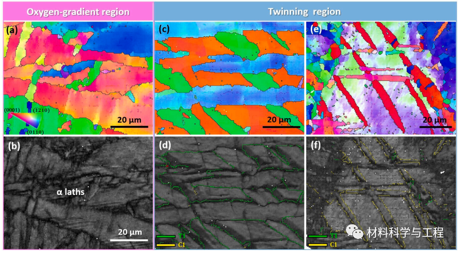 图4. OG-Ti拉伸断裂后的逆极图(IPF)和带状对比图。(a), (b) 氧梯度区域的显微结构。(c)-(f) 孪生区的显微结构。