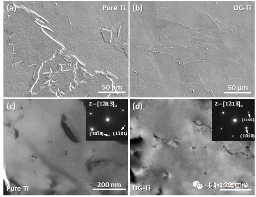 图1. 纯Ti和OG-Ti的初始微结构。(a) 纯Ti和(b) OG-Ti的SEM图像。(c) 纯Ti和(d) OG-Ti变形前的TEM图像。