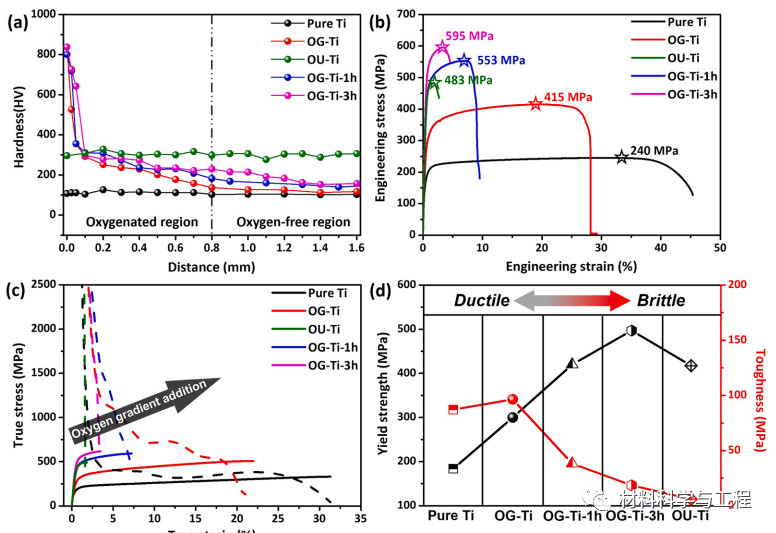 图2.充氧纯钛的硬度和拉伸行为。(a)横截面充氧纯钛的硬度分布。(b) 不同充氧条件下纯钛的工程应力-应变曲线。(c) 五种类型样品的拉伸真实应力-应变曲线和加工硬化率(虚线)。(d) 五种类型样品的屈服应力和韧性的比较。韧性是指包括缩颈部分在内的真应力-应变曲线下的面积。