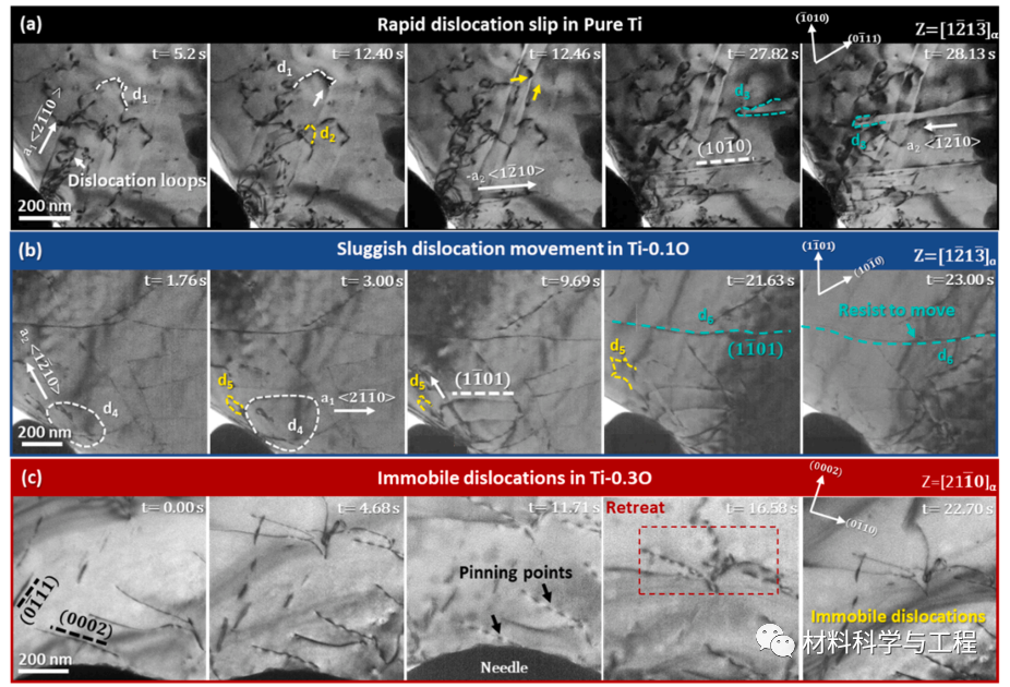 图6. 氧溶质和位错之间的动态相互作用。(a)纯钛,(b)Ti-0.1O和(c)Ti-0.3O薄片的实时压缩变形行为显示了不同的位错移动性和独特的滑移系统。