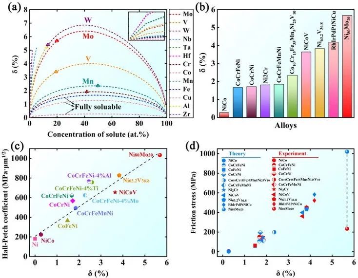 图1(a)不同镍基二元合金的失配参数δ作为溶质浓度的函数。(b) Ni80Mo20与其他SP-FCC合金的失配参数δ比较。(c)霍尔-佩奇系数和(d)摩擦应力与SP-FCC合金中δ的相关性。