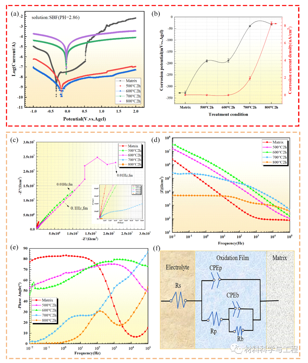 图5 Zr-2.5Nb基体及热氧化样品:(a)极化曲线图;(b)电流密度-自腐蚀电位变化曲线;(c)Nyquist图;(d)Bode模值;(e)Bode相角;(f)拟合电路图。