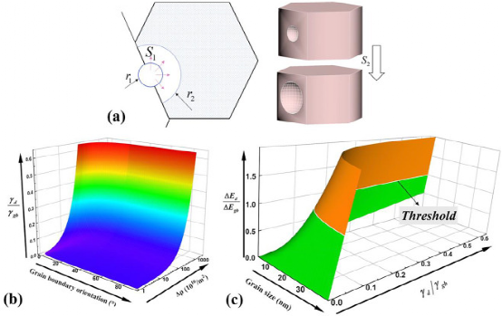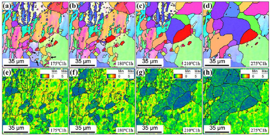 图2。温度历史显示为样品表面的嵌入式SEM图像和EBSD图例,前者显示热电偶和用于原位观察的聚焦区域。原位EBSD IPF图显示了(a)175°C/1 h、(b)190°C/1小时、(C)210°C/1 h、(d)230°C/1 h.(e)275°C/1 h。图5。显示区域A在(A)175°C/1 h、(b)180°C/1小时、(C)210°C/1 h、(d)275°C/1 h.的微观结构演变的IPF图。(e-h)对应于(A-d)的KAM图显示了存储的能量分布。图6。(a) 再结晶生长模型图解。(b) 显示了随着位错密度和晶界取向的变化,内能和晶界能之间的比值。(c) 示出了两个主要因素对能量的影响的阈值。