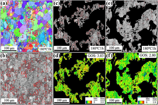 图7。IPF图显示了B区在(a)200°C/1 h和(B)210°C/1小时下的静态再结晶过程。黑色箭头指向晶粒生长方向,红线表示67°−73°晶界,蓝线表示27°−33°晶界。图11。(a) IPF图显示了180°C/1 h下的微观结构,对应于(b)具有晶界和典型孪晶分析的IQ图,反映了变形基体中存在一些86°张力孪晶(红色边界)。(c) 具有变形孪晶的区域的IQ图和(d)对应的KAM图。(e) 没有变形孪晶的区域的IQ图和(f)对应的KAM图。