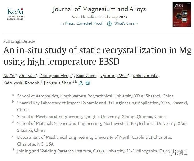 西工大镁合金顶刊《JMA》:高温EBSD原位研究镁的静态再结晶!