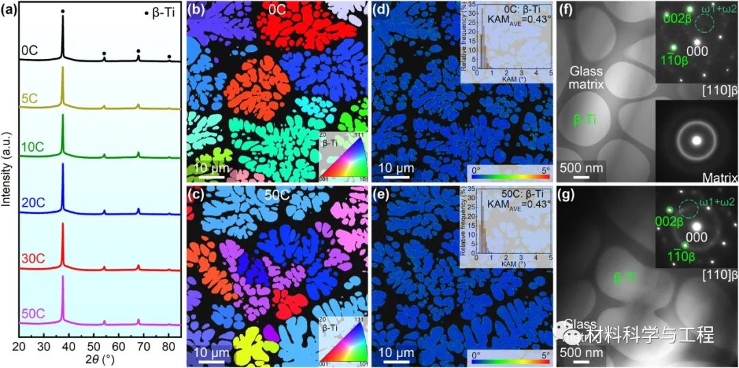 图1(a)铸态和低温热循环处理的金属玻璃复合材料的XRD图谱;(b)和(c) EBSD彩色图,(d)和(e) KAM图,(f)和(g) TEM显微图。