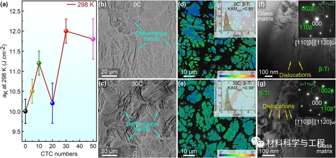 图3(a) 铸态和低温热循环处理的金属玻璃复合材料在298 K时的冲击韧性;(b)和(c)主裂纹旁边区域的SEM显微图,(d)和(e) KAM图,(f)和(g) TEM显微图。