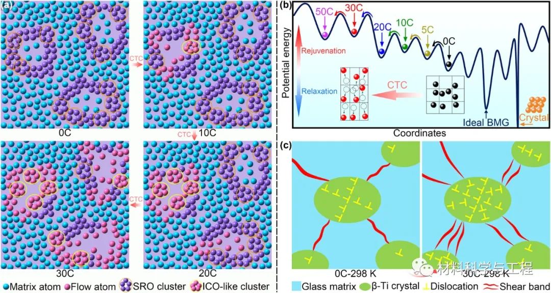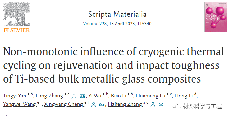 基于此,中科院金属所的研究团队系统地研究了低温热循环对含β-Ti枝晶Ti基金属玻璃复合材料组织和冲击韧性的影响。研究发现,低温热循环引起玻璃基体能量态的非单调演化,进而影响金属玻璃复合材料的冲击韧性。相关论文以题为“Non-monotonic influence of cryogenic thermal cycling on rejuvenation and impact toughness of Ti-based bulk metallic glass composites”发表在Scripta Materialia上。