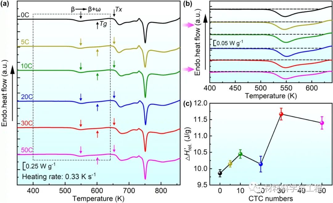 图2 (a)不同低温热循环处理的金属玻璃复合材料的DSC图谱;(b)在Tg之前的局部放大图;(c)弛豫焓随循环次数的演化。