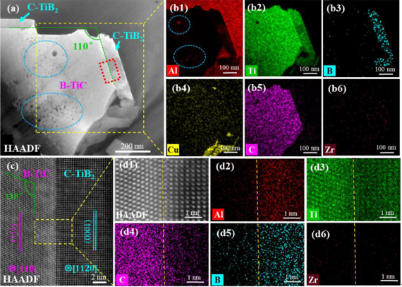 图6所示:(a) Al-Cu-Zr合金中TCB配合物成核底物的HAADF图像,(b1-b6) (a)中黄色矩形区域的EDS映射。(C)位于(a)中红色矩形位置的B-TiC和C- TiB2界面的HAADF图像,(d1-d6)原子分辨率HAADF图像以及B-TiC和C- TiB2对应的EDS映射。