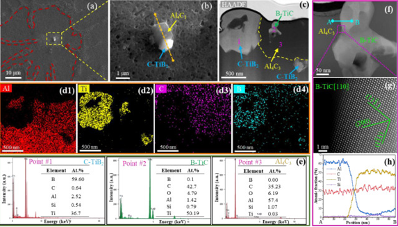 图5所示:(a)典型的C-TiB2形核底物,α-Al晶粒中心为Al4C3。(b) (a)中有核基底的放大图像。(C) (b)中黄色虚线所示的成核粒子的HAADF图像。(d1-d4)与(C)相关的Al、Ti、C、B元素的EDS映射。(e) (C)中“1-3”点的EDS分析和元素组成。(f) Al4C3中心b - TiC粒子的HAADF图像。(g)演化B-TiC的原子分辨率HAADF图像。(h)显示B-TiC和Al4C3界面上元素组成剖面的EDS线罐图。
