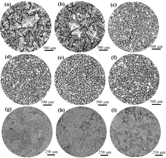 图2所示:(a - c) Al-7Si-0.4Mg合金的晶粒组织:(a)无晶粒细化剂;(b) 0.5 wt.% Al-5Ti-1B;(C)含0.1 wt.% Al-TCB。(d - f)在720℃下添加0.1 wt.% Al-TCB后不同保温时间Al-7Si-0.4Mg合金的晶粒结构:(d)保温60 min;(e)保持120分钟;(f)保温180 min。(g - i) Al-5Cu-0.15Zr合金的晶粒组织:(g)未加晶粒细化剂;(h) 0.5 wt.% Al-5Ti-1B;(i)含0.5 wt.% Al-TCB。
