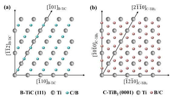 图7所示:b - TiC和C-TiB2具有平行或的平面的原子构型:(a) b - TiC (111), (b) C-TiB2(0001)。