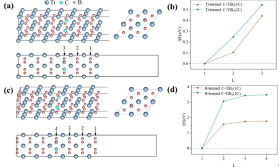图9所示:(a)不同位置掺杂C原子的端钛C- TiB2衬底和(b)相应基态总能量的变化。(C) b端C - TiB2底物和(d)不同C掺杂位置对应的基态总能的变化。(1C表示碳原子浓度较低,2C表示碳原子含量较高)。