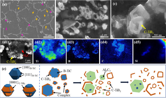 图10所示:(a-C) Al-TCB-7Si的微观结构,显示颗粒的分布和形貌。(d1-d5)从TCB络合物演化而来的C-TiB2粒子的形态和EPMA映射。(e)铝熔体中TCB络合物的演化过程示意图。