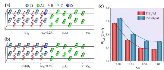 图14所示:TiB2/Al和C-TiB2/Al界面抗Zr中毒能力的研究:(a) TiB2/Al和(b) Zr原子掺杂的C-TiB2/Al界面模型。(C)上述两个界面中Wad随CZr的变化。