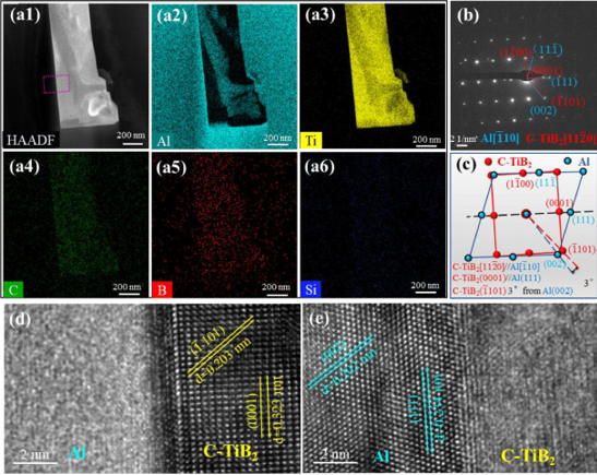 图8所示:(a1-a6) Al- TCB母合金接种Al-Si铸锭中成核粒子Al、Ti、C、B、Si元素的HAADF-STEM图像及相应的EDS映射。(b) (a1)中红框区域的SAED图形。(C) OR示意图:C - TiB2[] // Al[], C - TiB2 (0001) // Al(111), C - TiB2() 3°, Al(002)。(d, e) Al/C-TiB2界面的原子分辨率HRTEM图像,分别为[]C-TiB2和[]Al区轴。