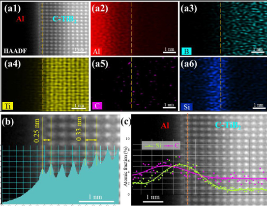 图11所示:(a)原子分辨率HAADF图像,显示C-TiB2/α-Al界面的原子结构和相应的EDS映射。(b)图11a放大图。(C) C和Si在C - TiB2 /α-Al界面的EDS线扫描图谱。经Al-TCB合金接种的Al-Si铸锭中,C-TiB2衬底位于α-Al晶粒中心。