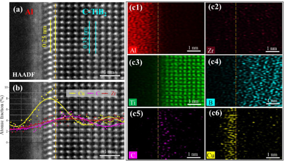图13所示:(a)显示C-TiB2/α-Al界面原子结构的原子分辨率HAADF图像。(b) C、Cu、Zr在C- TiB2/α-Al界面的EDS线扫描图谱及其对应的(C1-C6)映射。经Al-TCB主合金接种的Al-Cu-Zr锭中,C-TiB2衬底位于α-Al晶粒中心。