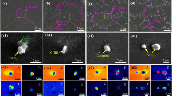 图4所示:(a-a2) Al-TCB主合金接种Al-Si铸锭中分别含有C-TiB2和Al4C3和(b-b2) C-TiB2底物的代表性组织。(C-C2)在Al-TCB主合金接种的Al-Cu-Zr锭中分别含有TCB配合物和(d-d2) C-TiB2底物的代表性组织。
