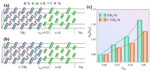 图12所示:Si在TiB2/Al界面和C-TiB2/Al界面吸附倾向的研究:(a) TiB2/Al界面和(b) C-TiB2/Al界面分别吸附Si的模型。(C)上述两个界面κSi(CSi)随CSi的变化。
