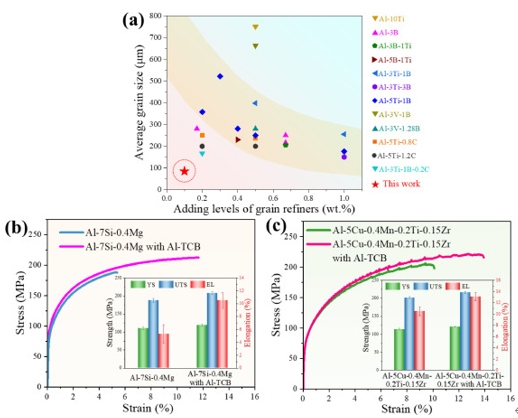 图3所示:(a) Al-7Si(-0.4Mg)合金晶粒细化剂的细化性能比较。(b)添加和不添加Al-TCB时Al-7Si-0.4Mg合金的典型工程应变-应力曲线和室温拉伸性能。(C)添加和不添加Al-TCB的Al-5Cu-0.4Mn-0.2Ti-0.15Zr合金的典型工程应变-应力曲线和室温拉伸性能。