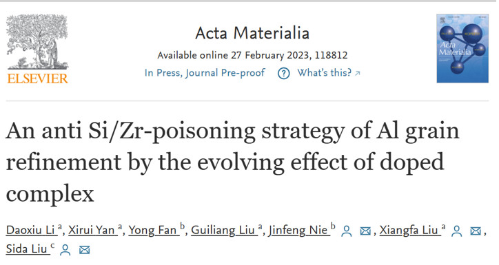 相关研究成果以题为“An anti Si/Zr-poisoning strategy of Al grain refinement by the evolving effect of doped Complex”发表在期刊Acta Materialia上。