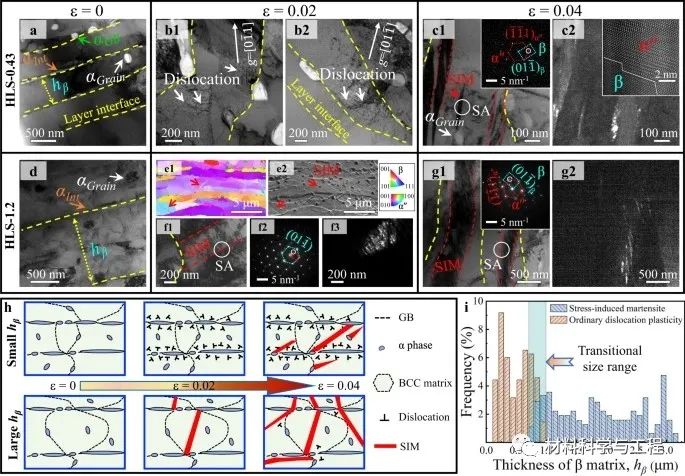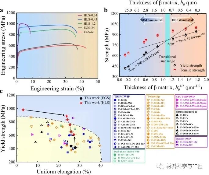 事实上,存在两种经典的策略来强化亚稳合金。第一种是通过增加相稳定性来调控从应力诱导马氏体形变(SIM)到孪晶形变,甚至到普通位错塑性(ODP)转化的变形机制。然而,这种策略未能在不改变化学成分的情况下调节从ODP到SIM或孪晶的机制顺序;也就是说,当ODP首先出现在合金中时,随着塑性应变的增加,不存在变形机制的转变。第二种是通过结构异质性设计实现空间限制,其中由晶界、层间界面和/或沉淀体施加的空间限制可以控制塑性载体的激活。其中,异质层状结构(HLS)通过在硬-稳定和软-亚稳组分中组合ODP和SIM,使我们能够轻松地实现这一目标。因此,迄今为止通过尺寸限制效应有效延迟单相亚稳合金中TRIP或TWIP的激活,以实现从ODP到SIM或孪晶的顺序激活,是一个巨大的挑战。因此,有必要设计一种异质结构,能够充分利用亚稳相中的应变依赖机制转变,先激活ODP,然后再激活SIM或孪晶,从而显著增强σy,而不会牺牲ɛf(尤其是ɛU)。