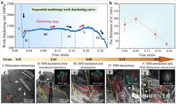图6 HLS-0.43 β-Ti合金的多级加工硬化行为及其机制。