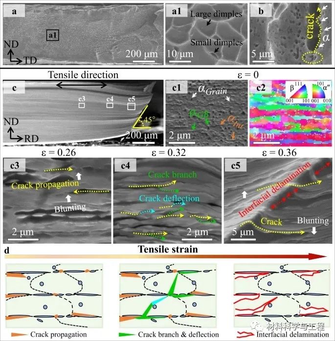 图5 HLS-0.43 β-Ti合金的断裂行为及其机理。