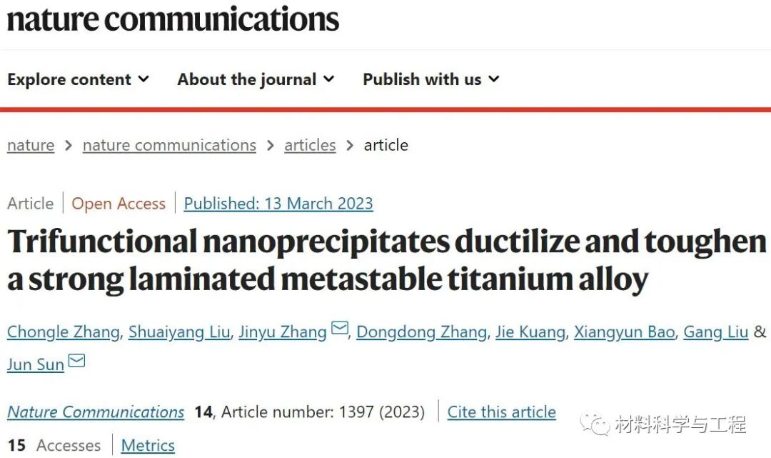 在此,来自西安交通大学孙军院士团队使用一种亚稳态Ti-1Al-8.5Mo-2.8Cr-2.7Zr(重量百分比)合金作为模型材料,制备了一种异质层压结构,其表面有多种形态的α-纳米沉淀物,实现了三重功能纳米析出相塑韧化高强层状亚稳钛合金。相关论文以题为“Trifunctional nanoprecipitates ductilize and toughen a strong laminated metastable titanium alloy”发表在Nature Communications上。