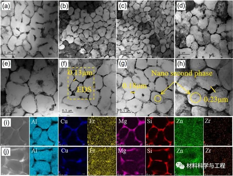 图2:不同样品的TEM图像:(a, e)打印态;(b, f)150℃×2h;(c, g)150℃×4h;(d,h)150℃×14h;(i)150℃×2h、(j)150℃×4h的EDS面扫谱图。