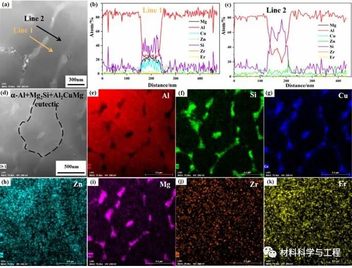 图4 (a) (b) Line1和(c) Line2的EDS线扫描路径及对应结果;(d)胞状结构形态;(e-k) (d)元素分布图