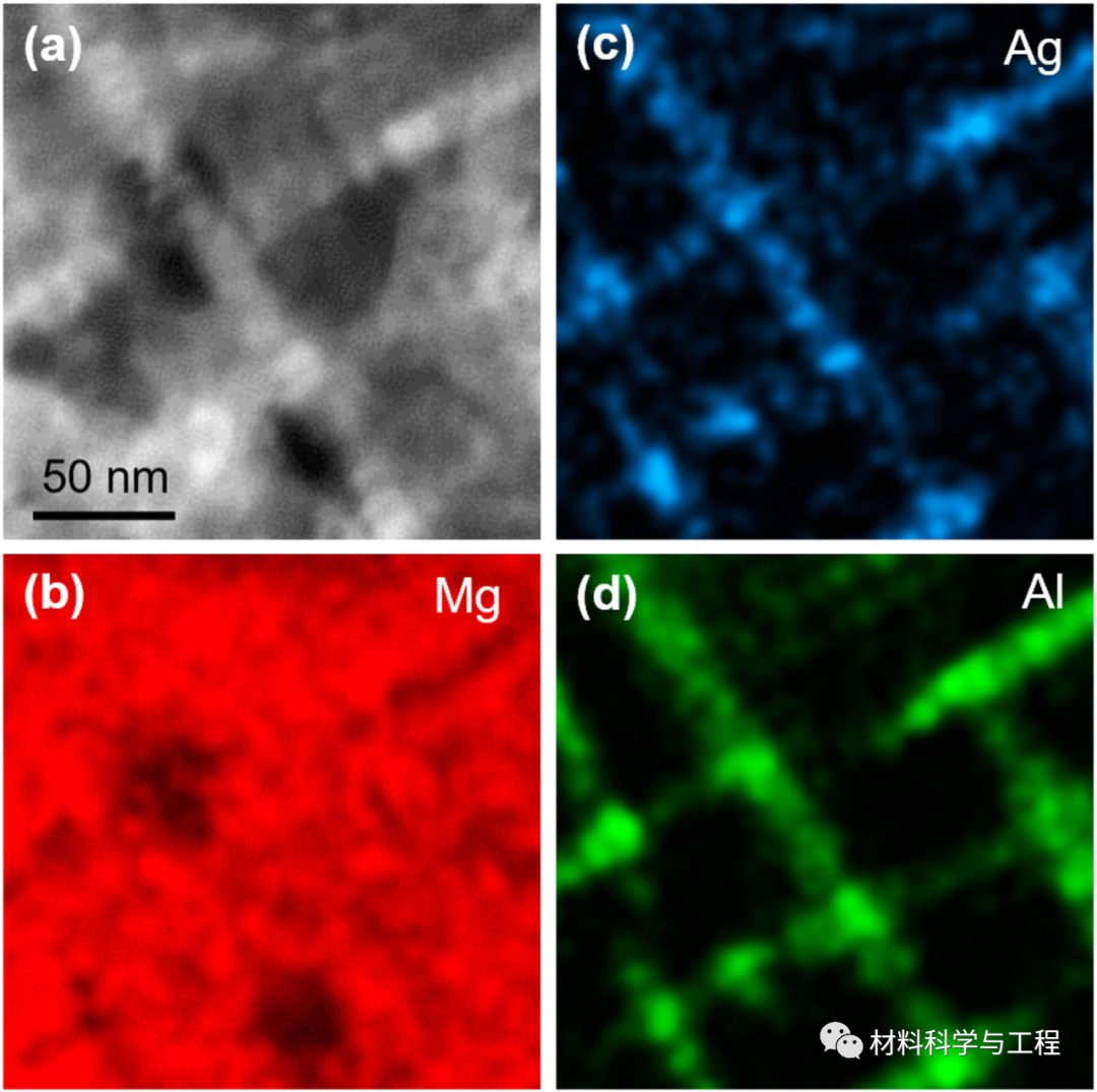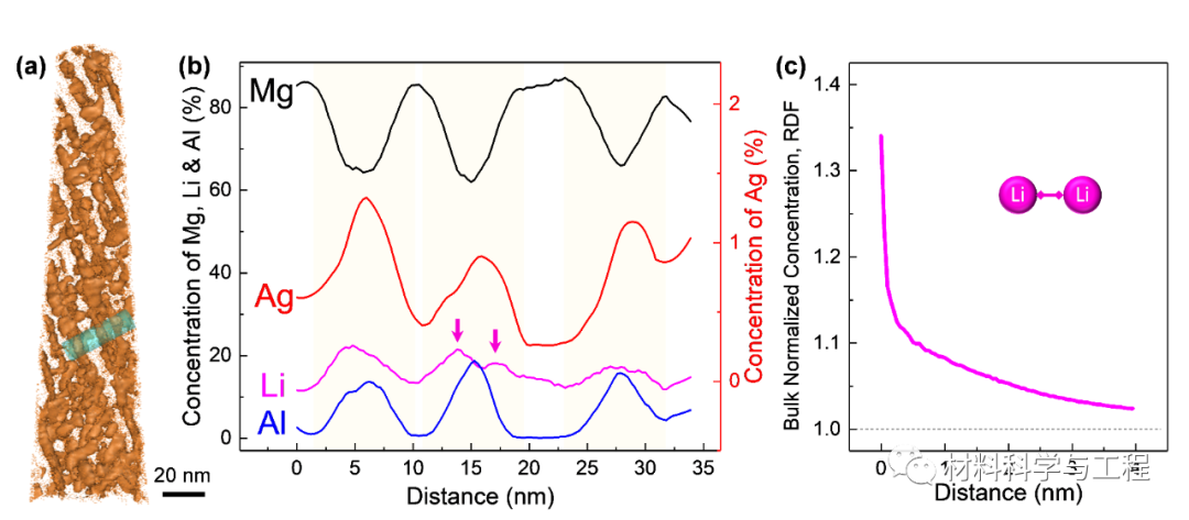 图3. BCC镁锂铝银合金HAADF-STEM及EDS能谱图图4. BCC镁锂铝银合金10at.%Al等成分面图、一维成分分析及Li-Li RDF图以上工作得到国家重点研发计划课题、国家自然科学基金、江苏省自然科学基金、中央高校基本科研业务费等项目支持!近年来,项目团队有关BCC镁锂合金设计及性能调控的代表性论文如下:[1]Tongzheng Xin, Yuhong Zhao, Reza Mahjoub, Jiaxi Jiang, Apurv Yadav, Keita Nomoto, Ranming Niu, Song Tang, Fan Ji, Zakaria Quadir, David Miskovic, John Daniels, Wanqiang Xu, Xiaozhou Liao, Long-Qing Chen, Koji Hagihara, Xiaoyan Li, Simon Ringer, Michael Ferry, Ultrahigh specific strength in a magnesium alloy strengthened by spinodal decomposition, Science Advances 7(23) (2021) eabf3039.[2]Song Tang, Tongzheng Xin, Wanqiang Xu, David Miskovic, Gang Sha, Zakaria Quadir, Simon Ringer, Keita Nomoto, Nick Birbilis, Michael Ferry, Precipitation strengthening in an ultralight magnesium alloy, Nature Communications 10(1) (2019) 1003.[3]Tongzheng Xin, Song Tang, Fan Ji, Luqing Cui, Binbin He, Xin Lin, Xiaolin Tian, Hua Hou, Yuhong Zhao, Michael Ferry, Phase transformations in an ultralight BCC Mg alloy during anisothermal ageing, Acta Materialia 239 (2022) 118248.[4]Song Tang, Zongde Kou, Tongzheng Xin, Zijian Zhang, Tao Feng, Ting Luo, Si Lan, Gerhard Wilde, Bin Jiang, Achieving high strength via solutes co-clustering and solvents redistribution in an ultralightweight BCC magnesium alloy, Materials Research Letters 11(7) (2023) 556-562.[5]Song Tang, Tongzheng Xin, Wanqiang Xu, David Miskovic, Chuanqiang Li, Nick Birbilis, Michael Ferry, The composition-dependent oxidation film formation in Mg-Li-Al alloys, Corrosion Science 187 (2021) 109508.