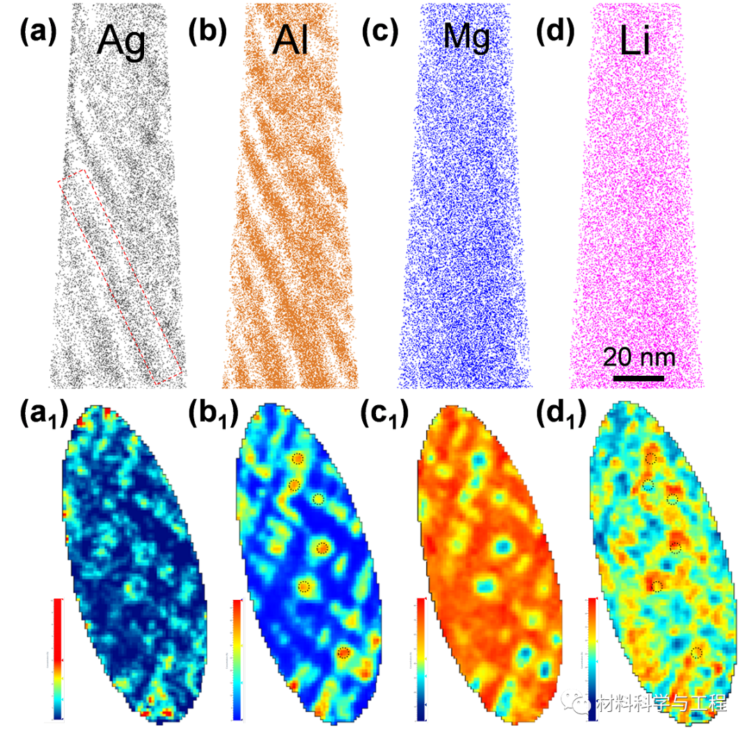 图2. BCC镁锂铝银合金三维元素分布及其二维成分等高图