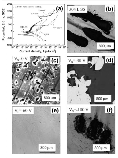 图22 在由DOMS + PDCMS组合沉积的3.5wt%NaCl水溶液CrN/TiN超晶格涂层中的耐点蚀性:(a)循环动电位极化曲线;(b) 基材表面被腐蚀;(C-F)在-30至-100 V基底偏置处沉积的涂层表面被腐蚀。