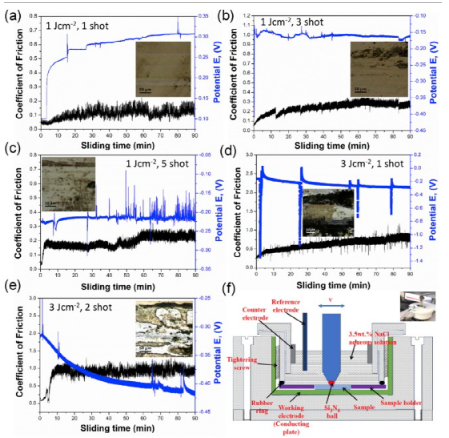 图32 在3.5 w.t%NaCl水溶液中OCP和COF的变化随滑动时间的变化,以及以1-3 Jcm-2的能量密度和1-5的喷射次数照射涂层摩擦腐蚀轨迹的插入光学显微照片。