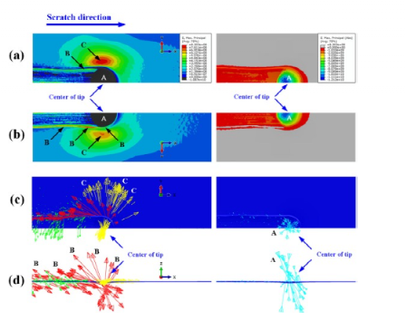 图14 在 0.11 Pa 时,法向载荷为 21.0 N 时铜膜的最大主应力 σ1:(a) 轮廓图(外表面视图),(b) 轮廓图(界面视图),(c) 应力方向(外表面视图)和 (d) 应力方向(横截面视图)。