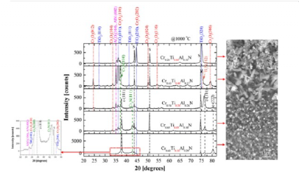图25 在环境空气中以1000°C退火后CrTiAlN涂层的XRD图谱和顶视图SEM显微照片。
