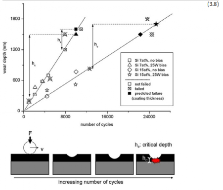 图34 TiAlSiN薄膜的磨损深度延伸表明涂层失效。开放符号对应于未失效的涂层,填充符号对应于预测的失效(用涂层厚度估计),交叉符号对应于失效的涂层。