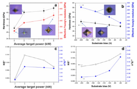 图19 a, b, 硬度 (H), 有效杨氏模量 (E*);c、d、H/E* 和 H3/E*2 HiPIMS 在各种目标功率和负基板偏压下沉积的 Ti-C-N 涂层的比率。在 a 和 b 中插入微维氏压痕。