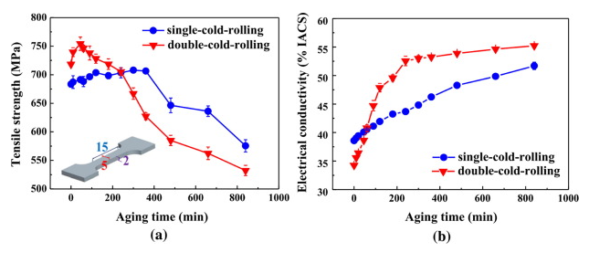 图34。450℃等温时效80%冷轧Cu-Cr系合金的硬度(a)和电导率(b)