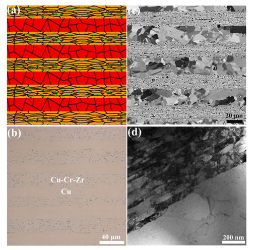图35。Cu-Cr-Zr合金的显微组织(a)温挤压(粗晶状态),(b)温挤压- HPT工艺,(c) 450℃时效1h 图38。退火后ARB Cu/Cu- Cr - Zr层状复合材料的典型微观结构(a) DHLedCu/Cu- Cr - Zr层状复合材料结构示意图;DHLed Cu/Cu- Cr - Zr层状复合材料的截面光学显微镜(b)和SEM-BSE图像(c);(d) Cu/Cu- Cr - Zr界面TEM显微图。技术的进步导致对性能优异的铜合金的需求增加。某些应用要求耐高温软化、耐腐蚀、抗氧化、抗应力松弛、可弯曲性、残余应力、可焊性、线膨胀系数和焊接性能。开发具有HSC等优异综合性能的新型铜合金势在必行。利用HSC开发铜合金旨在为大规模集成电路引线框架材料、电力和机械制造等工业应用提供低成本、高性能的导电铜合金。然而,通过高压扭转和等道角压等方法制备具有超细晶粒的高强度、高导电性Cu合金在大规模工业应用方面存在挑战,且生产成本高于传统铸造方法。因此,未来铜合金的发展必须在探索新型制备方法的同时考虑大规模工业化和生产成本。