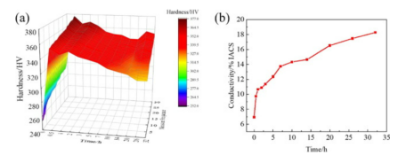 图32。工艺2处理Cu-3.18Ti (wt.%)合金在400℃下不同时间的时效曲线:(a)硬度;(b)电导率。