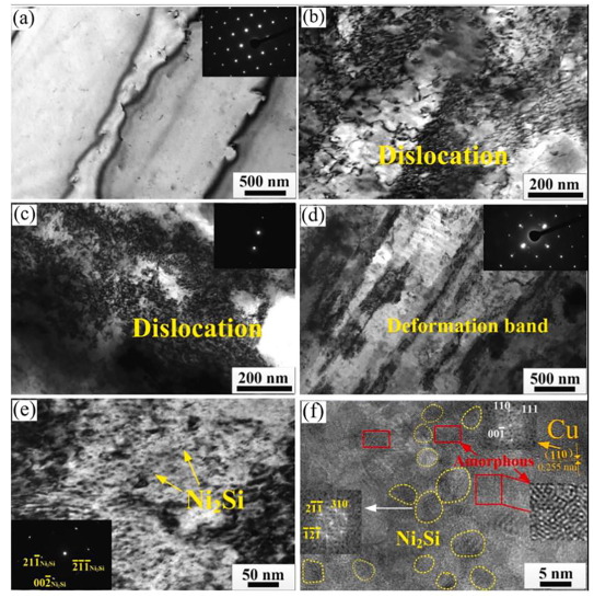 铜因其显著的性能而备受关注,包括高导电性(EC)和导热性、优异的耐腐蚀性、可镀性和良好的机械性能。因此,铜及铜合金在机械制造、交通运输、电子电气工程等各个工业部门得到了广泛的应用。近年来,电子和电气工业的发展导致对铜合金的需求增加。一方面,集成电路水平的提高导致终端数量的增加,这反过来又对EC和导热性提出了更高的要求。另一方面,引线框架的厚度需要进一步减小,这就对铜合金的强度提出了更高的要求。然而,几十年来,研究人员在打破强度和延伸率与高强度和导电性(HSC)之间的权衡方面遇到了挑战。含HSC的Cu合金的强化机制主要有固溶强化、析出强化、细晶强化和位错强化。除了沉淀强化外,其他强化机制可能会产生大量的晶体缺陷,从而对EC产生不利影响。因此,如何在不牺牲电导率的前提下大幅度提高合金的强度,一直是铜合金研究领域关注的问题。沉淀强化是实现Cu合金HSC的主要方法。一方面,时效过程中析出相的形成阻碍了位错的移动,从而提高了强度。从其他方面考虑,析出相的形成降低了合金基体中溶质原子的浓度,导致电子散射减少,从而增加了EC。此外,近年来,利用异质变形诱导(HDI)硬化强化Cu合金的研究也非常广泛。综上所述,为了进一步提高Cu合金的综合性能,有必要开发新型的沉淀强化Cu合金。北京科技大学郭明星教授联合中铝科学院娄花芬教授等人为了在析出强化Cu合金中获得优异的强度、EC和弹性,综述了含HSC的先进Cu合金的最新研究进展,重点关注成分、组织和析出行为的控制,重点研究了HSC在Cu合金中的强化机制,并对典型的析出强化Cu合金(Cu- ni - si、Cu- ti和Cu- cr - zr合金)进行了全面的综述。在此基础上,展望了含HSC铜合金的未来发展趋势。本篇综述中,概述了电导率和析出强化铜合金强度之间的关系,可以得出下列结论和展望。析出强化仍然是设计含HSC铜合金的主要原理。然而,传统工艺和合金元素在突破强度-电导率-电导率权衡方面存在局限性。近年来在非均相组织设计和控制方面取得的进展表明,这些合金的综合性能有望得到提高,包括多尺度结构、梯度晶粒结构、双峰晶粒组织、层状纳米结构等。析出强化Cu合金的特殊组织对合金的析出行为和力学性能都有显著的影响。解决强度和导电性之间的权衡至关重要,以同时实现高强度和导电性,以满足工业应用中对这些性能日益增长的需求。析出行为是影响析出强化Cu合金力学性能的关键因素。进一步深入研究这三种Cu合金中析出相的演变,包括析出相与Cu基体的取向关系。而控制析出相的形核、生长和分布,使强度贡献最大化,则需要深入研究,是未来研究的关键方向。相关研究成果以题为“Recent development of advanced precipitation-strengthened Cu alloys with high strength and conductivity: A review”发表在Progress in Materials Science上。链接:https://www.sciencedirect.com/science/article/pii/S0079642523000737